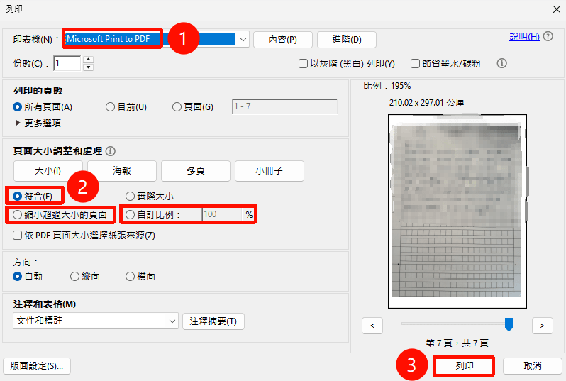 印表機選:Microsoft Print to PDF(Windows),儲存成 PDF(macOS),設定縮放:縮小(例如 50%、25%),或「適合可列印區域」,