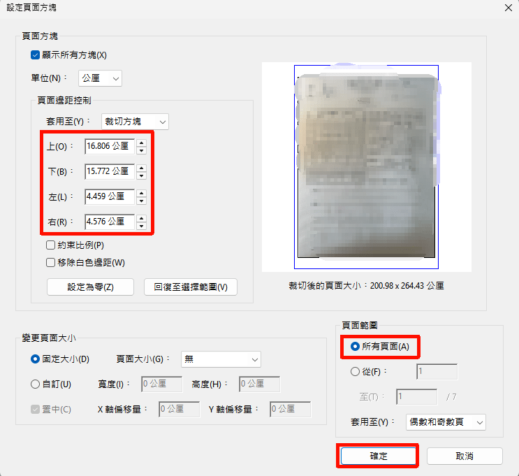 開啟 PDF,工具 → 編輯 PDF → 裁切頁面,用滑鼠框出「實際內容需要的大小」,雙擊裁切框 → 設定頁面範圍為「套用到所有頁面」,確認。(或工具 →組織頁面→選取頁面→右鍵選單→裁切頁面→輸入邊界值,並套用到所有頁面;或工具 → 列印作品→設定列印方塊)。